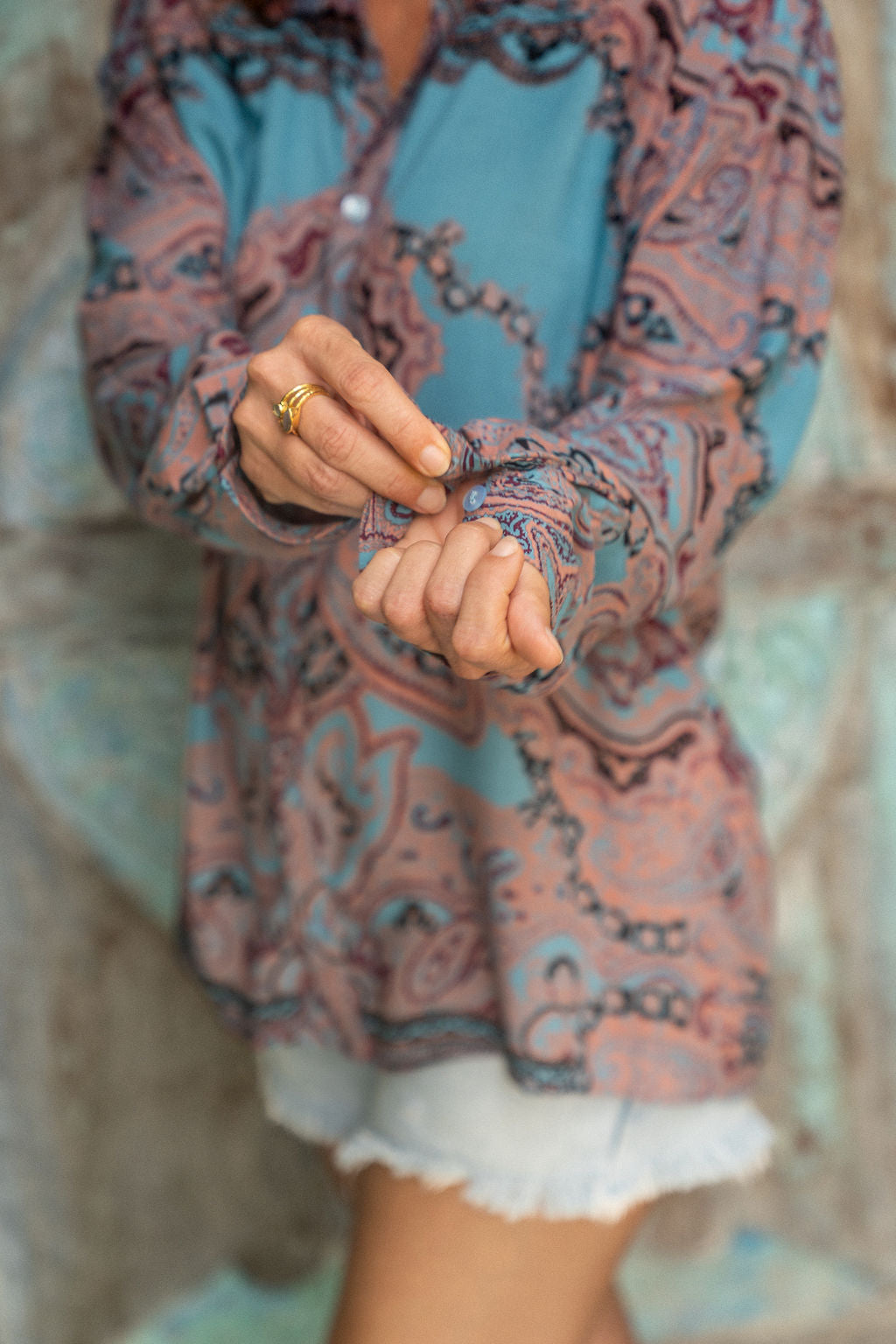 La stampa paisley richiama un'estetica boho chic sofisticata, perfetta per creare outfit primaverili ed estivi versatili. Il taglio morbido e fluido valorizza la silhouette senza costringere, rendendola ideale sia per un look casual da giorno che per un outfit più ricercato da sera.