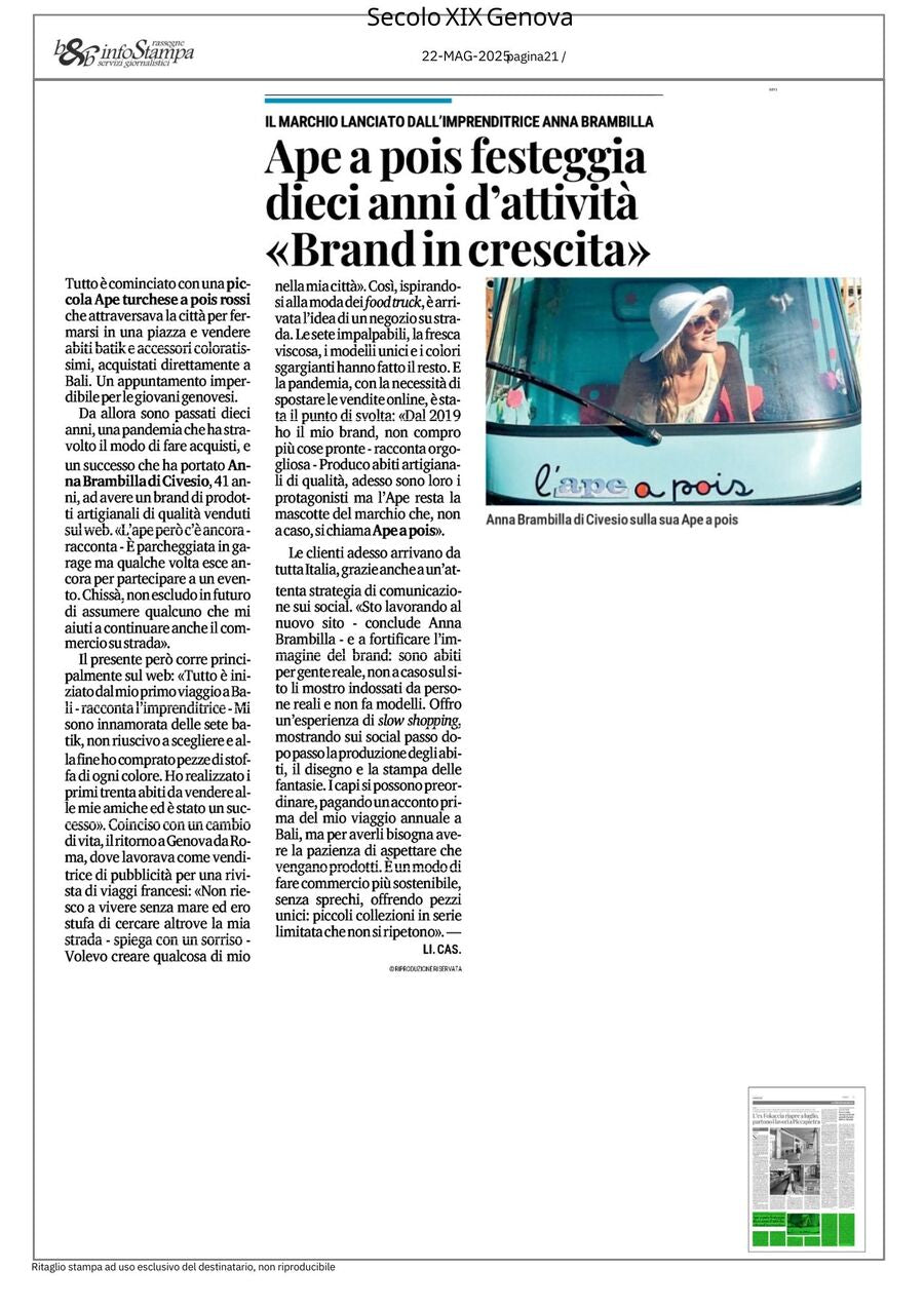 a bordo di un'Ape Piaggio "a pois" allestita a negozio! In seguito alla pandemia, l'attività si è trasformata, per forza di cose, in Shop Online ma la mitica apetta rimarrà per sempre la mascotte del Brand.