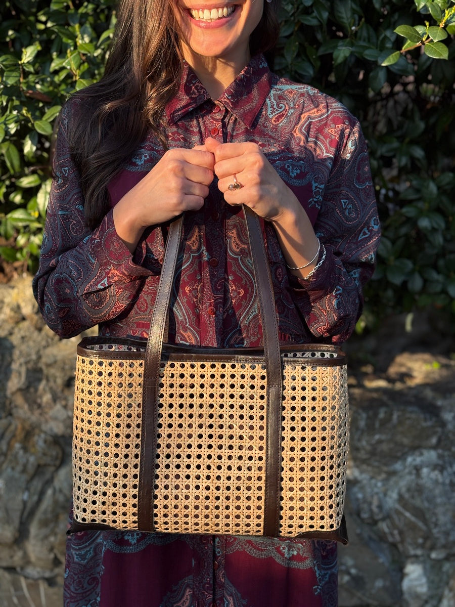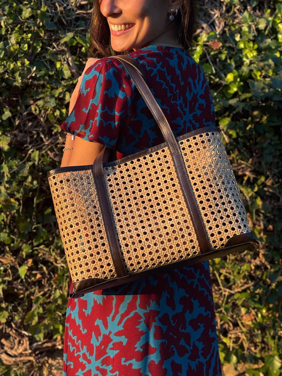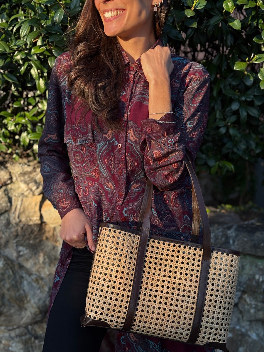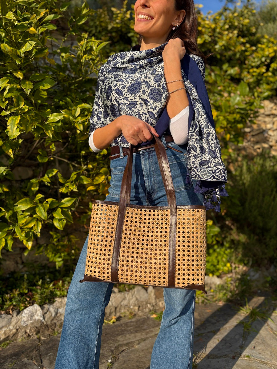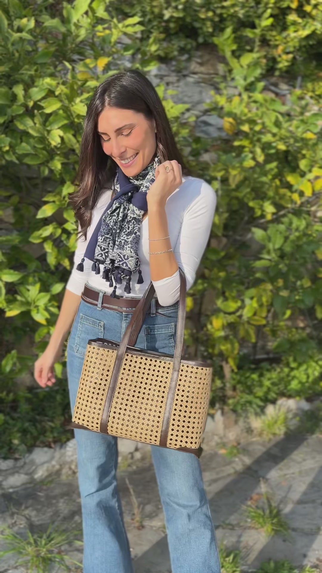Realizzata in paglia intrecciata (paglia di Vienna) con dettagli in cuoio, questa tote bag unisce artigianalità, eleganza e praticità in un accessorio senza tempo, perfetto per accompagnarti nelle giornate più calde.